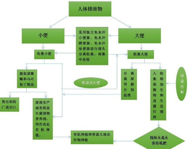 免水沖微生物廁所可以在半個(gè)小時(shí)左右的時(shí)間中,將糞便當(dāng)中的有機(jī)物降解成粉末狀的小分子,然后微生物就會(huì)不斷的將糞便分解成二氧化碳,水蒸氣,少量的氨氣和熱量等等,產(chǎn)生的水蒸氣二氧化碳和氨氣將會(huì)被蒸發(fā),而分解后所剩余的殘?jiān)鼘?huì)被回收利用制成有機(jī)肥料,用來(lái)農(nóng)作物灌溉。