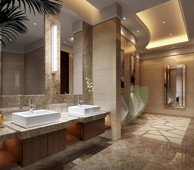 1、基本配置:不銹鋼自動開啟蹲便器、小便器、防滑火燒板地面、化妝鏡、衣帽鉤、手紙盒、廢紙簍、照明燈、換氣扇、指示牌等